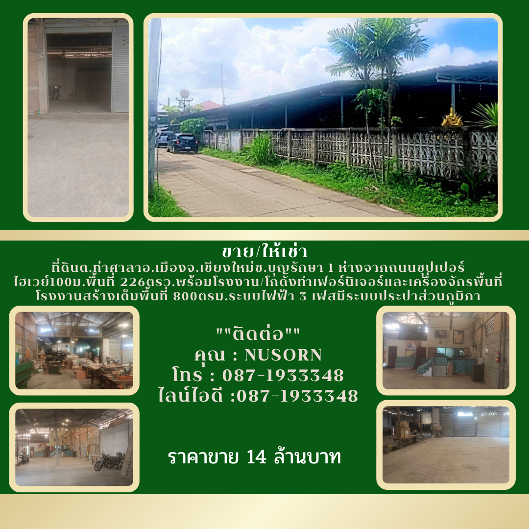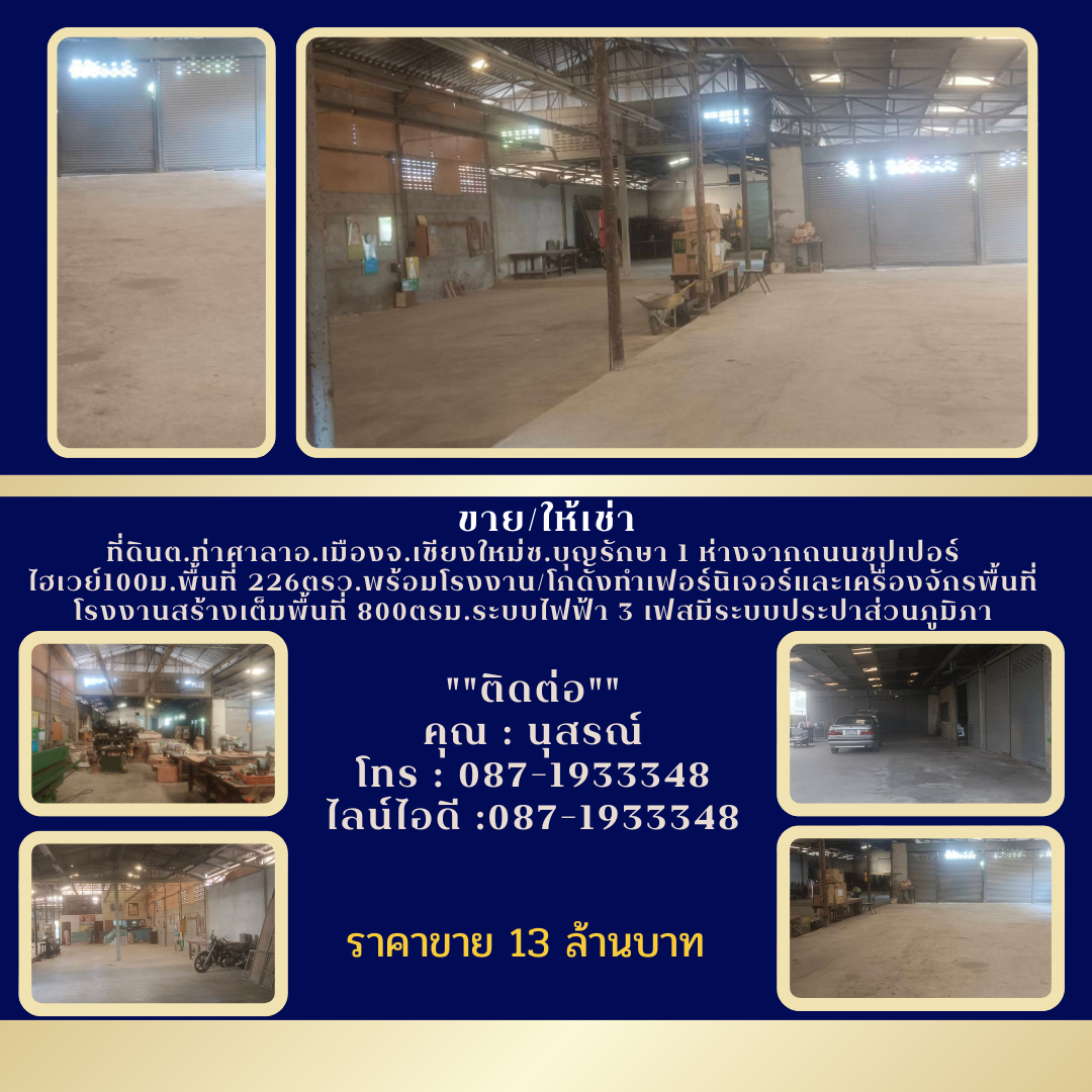 ขาย/ให้เช่าที่ดินต.ท่าศาลาอ.เมืองจ.เชียงใหม่ซ.บุญรักษา 1ห่างจากถนนซุปเปอร์ไฮเวย์100ม.พื้นที่ 226ตรว.พร้อมโรงงาน/โกดัง